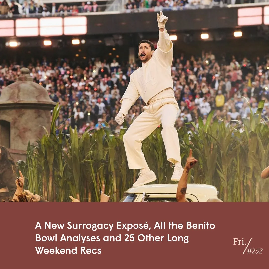 OBVIOUSLY we have to start with my favourite Benito Bowl recaps, hot takes and cultural analysis: this explainer from Vox’s Izzie Ramirez is a good read, as is Mekita Rivas’ lovely essay for Elle, the L.A. Times’ reflection on Ricky Martin’s cameo and NPR’s dispatch from Bad Bunny’s official watch party in San Juan, Puerto Rico. Also: this blog post by Yusra Suedi, assistant professor of International Law at the University of Manchester, on how the halftime show reflected international law, and this TikToker who talks about colonization and plants, who has posted two really interesting videos about this in context of the halftime show, one on sugar cane and the other about plantain.